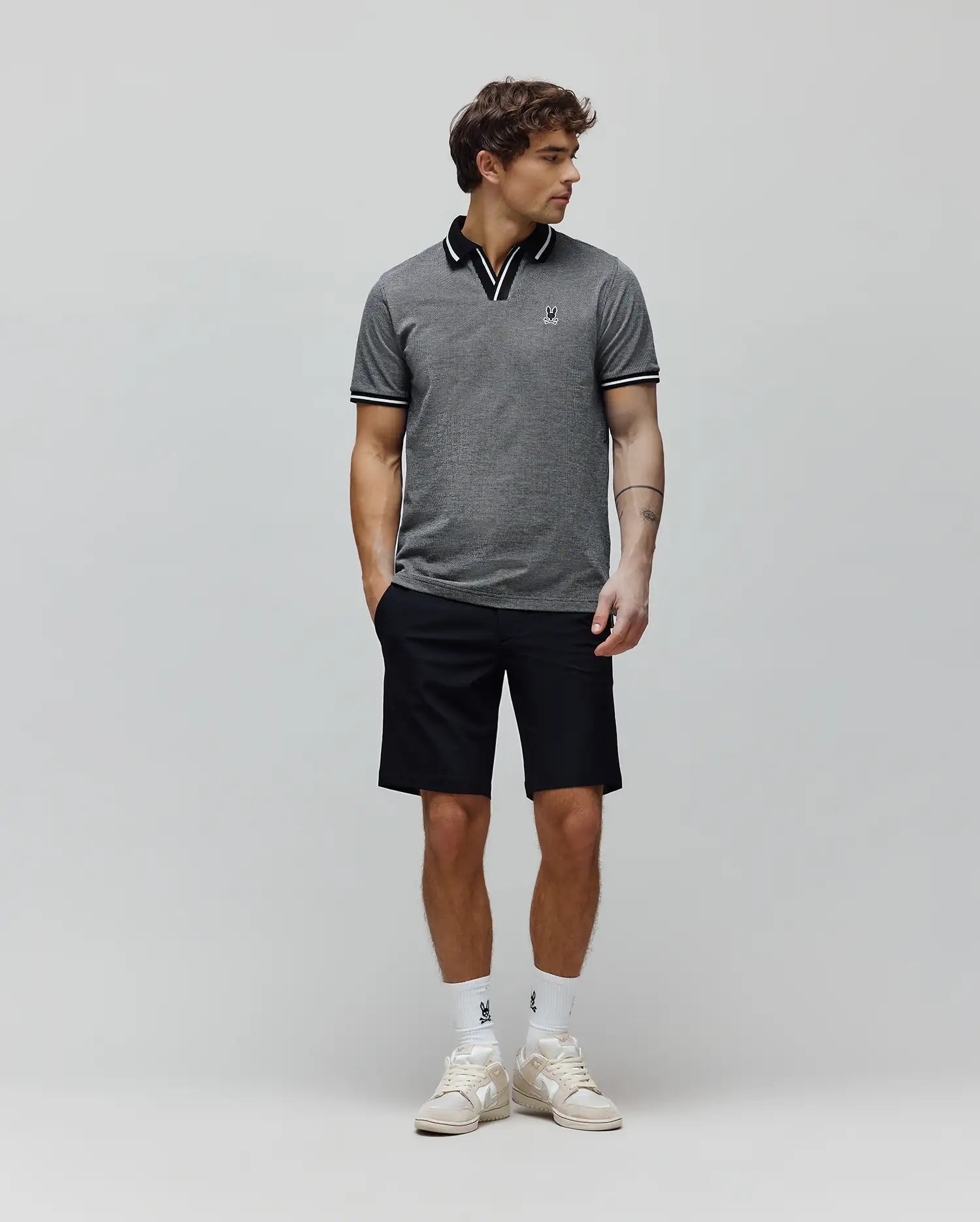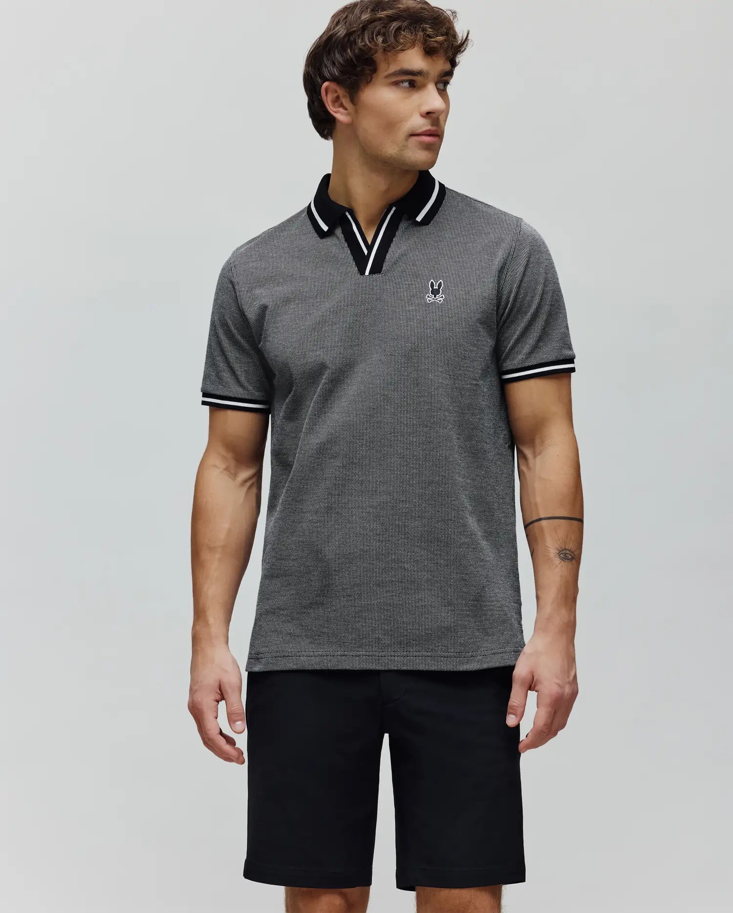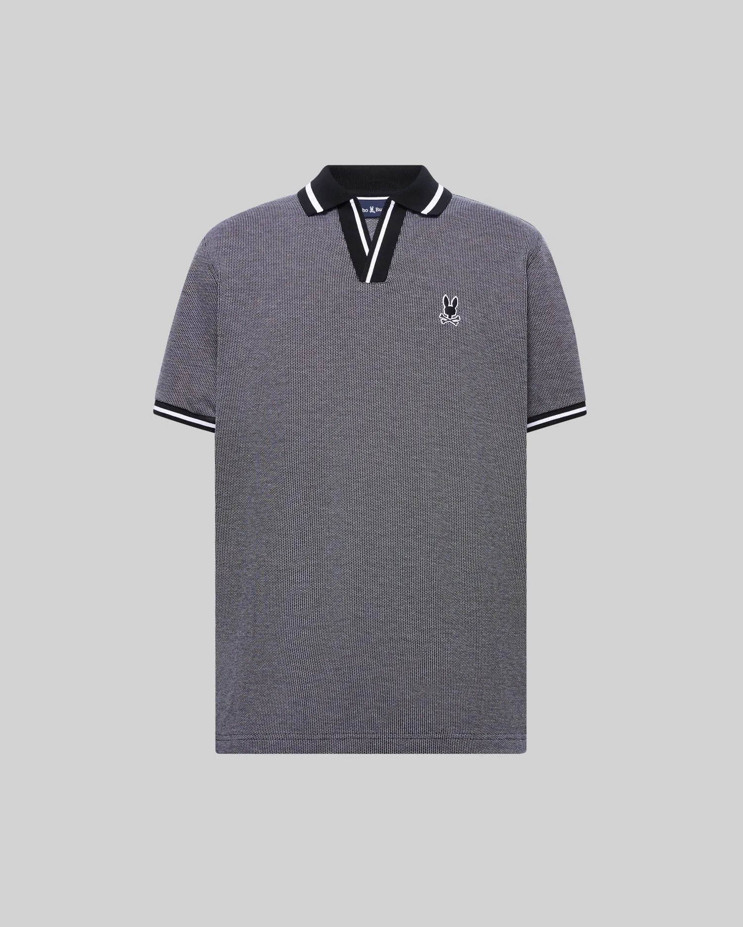 The Josiah Johnny Collar Jacquard Polo is knit from 100% Pima cotton. It features a tonal outline Bunny and a Johnny collar.