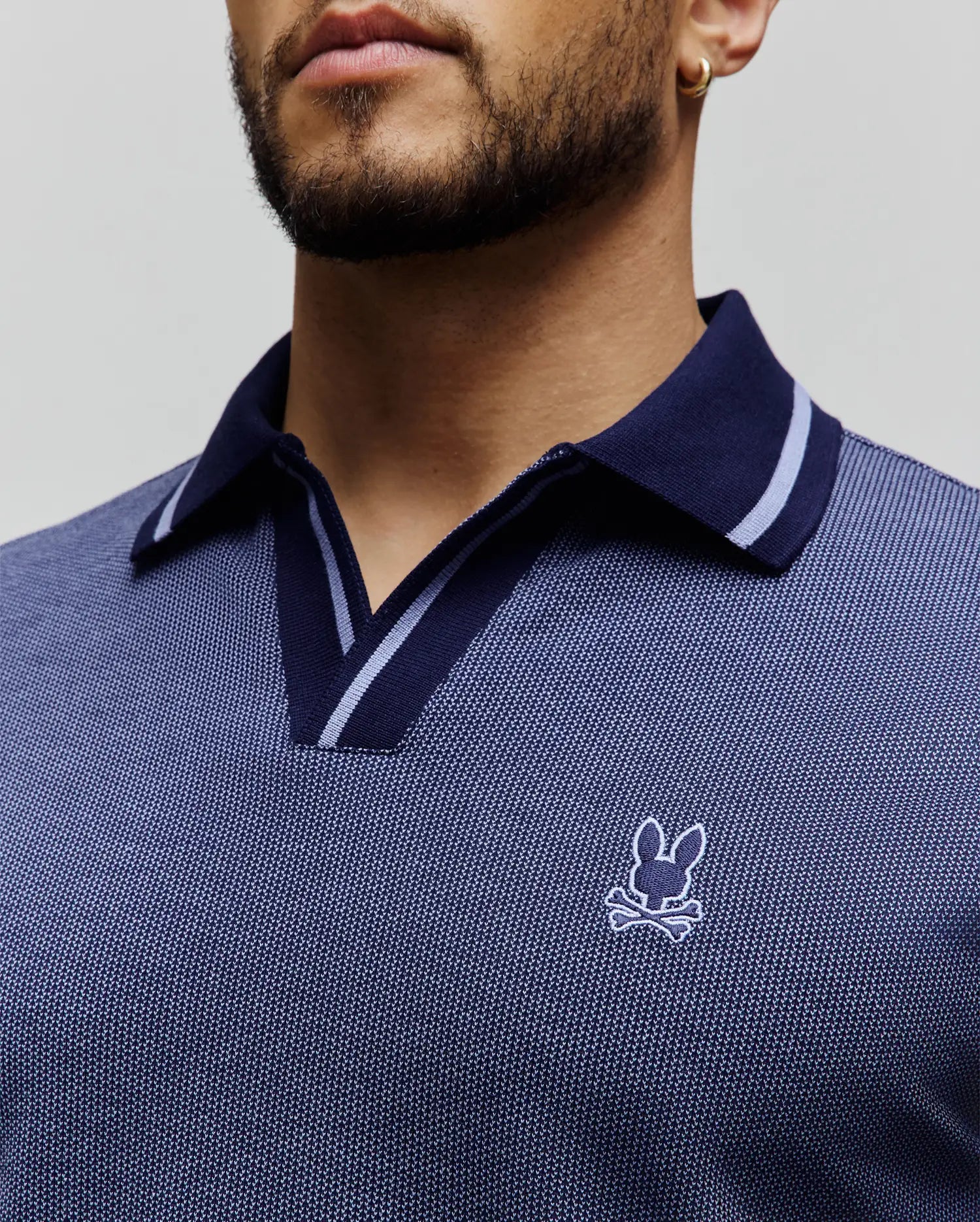 The Josiah Johnny Collar Jacquard Polo is knit from 100% Pima cotton. It features a tonal outline Bunny and a Johnny collar.