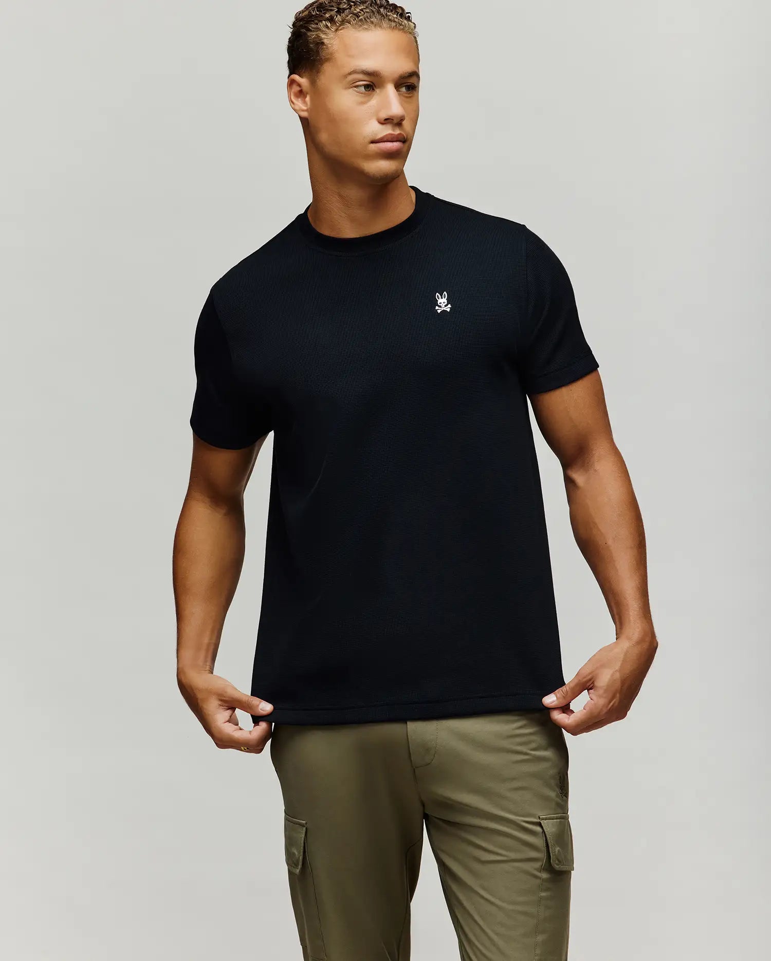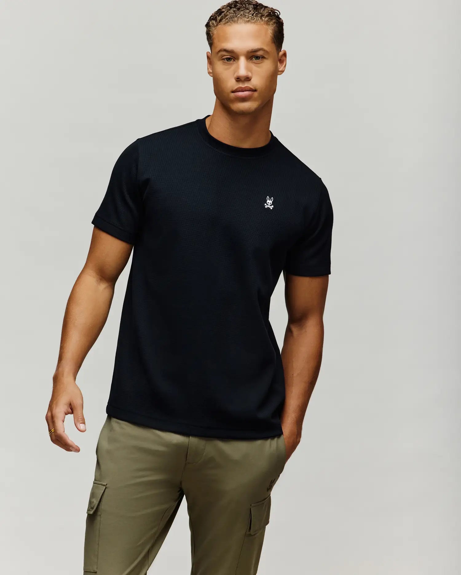 The Maxton Waffle Tee is knitted from a cotton blend. It features a textured waffle structure that gives visual depth and a soft feel.